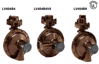 | LV404B4 | ¼" F. NPT | ½" F. NPT | .219 | 11" w.c. at 100 PSIG Inlet | 9" - 13" w.c. | Down | Over Outlet | 525,000 | 404PE |