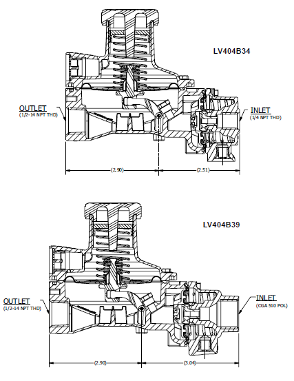 | LV404B34 | ¼" F.NPT | ½" F.NPT | .100 | 11" w.c. @ 100 Psig Inlet | 9" to 13"w..c. | Rear | Outlet | 450,000 |