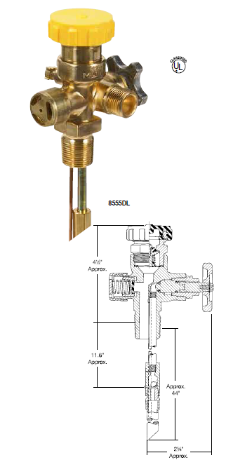 | 8555DL11.6 | ¾” M. NGT | CGA 555* | 1¾” M. ACME | Knurled | 11.6” | 44” | 375 PSIG |